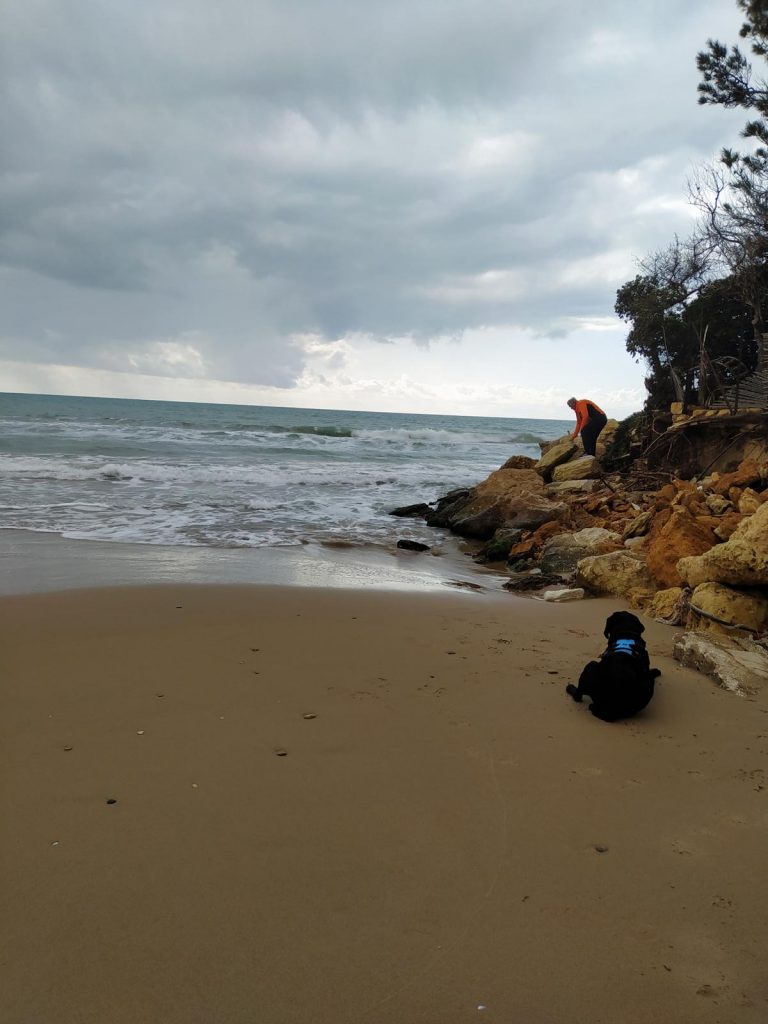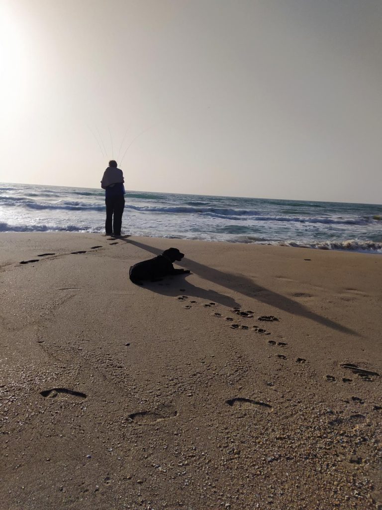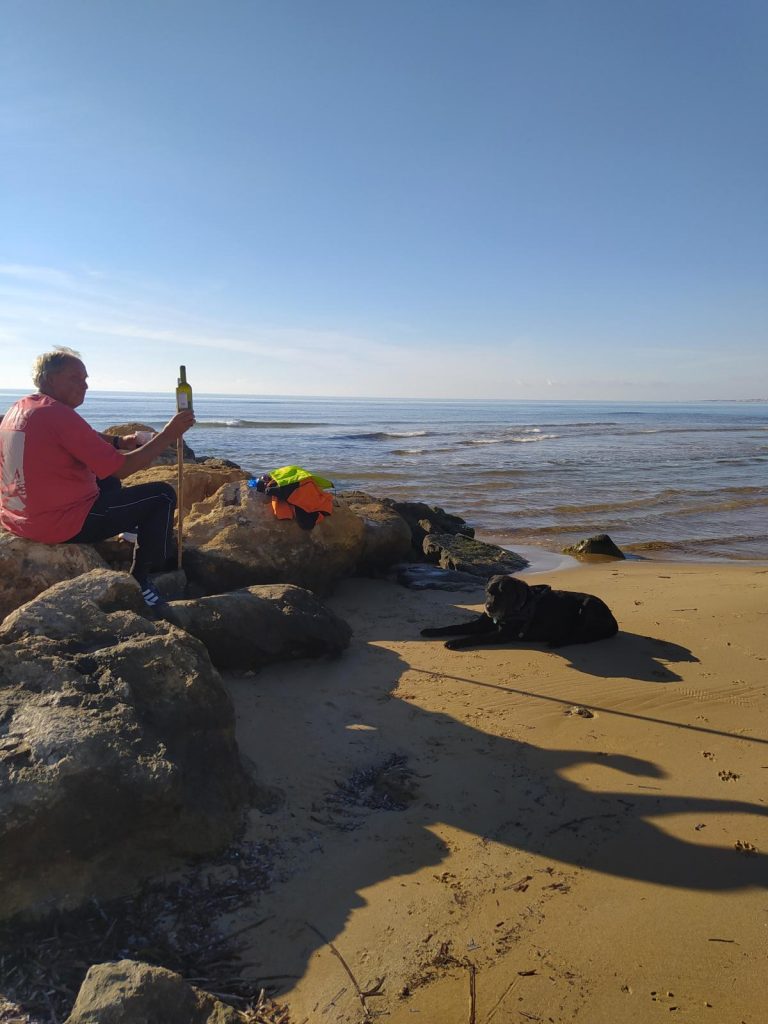 Vorab, gefangen hat wohl keiner etwas, also ich hab jedenfalls nix gesehen mit dem Fernglas. Eine Außendusche hielt sogar Frischwasser bereit. Wild stehen ist das Motto, für die Van-Life Bewegung ohnehin quasi Pflicht, weil das Budget eben nicht mehr hergibt. So sollen sich laut Informationen auf der Peleponnes, wo wir ja im Dezember-Januar hinwollen, hunderte davon zur Zeit aufhalten. Wir werden sehen. Ein negativer Effekt ist sicher, daß diese Vans oft nicht über ein WC verfügen, sondern nur Matratze und Gaskocher und natürlich Handy und Tablet an Bord haben. Sie müssen gezwungenermaßen in die Wildnis kacken. Und das tun sie auch. Denn öffentliche Toiletten sind absolut Mangelware. Beim Walk mit den Hunden nahm ich Kontakt zu dem Bimobil-Fahrer auf, der sich als Uwe aus Aurich und ehemaliger Vollzugsbeamter outete. Er bat mich, die am Strand liegende, bereits tote und verwesende, Schildkröte „Karetta Karetta“ in ein von ihm zuvor tief ausgegrabenes Loch zu transportieren. Das tat ich.