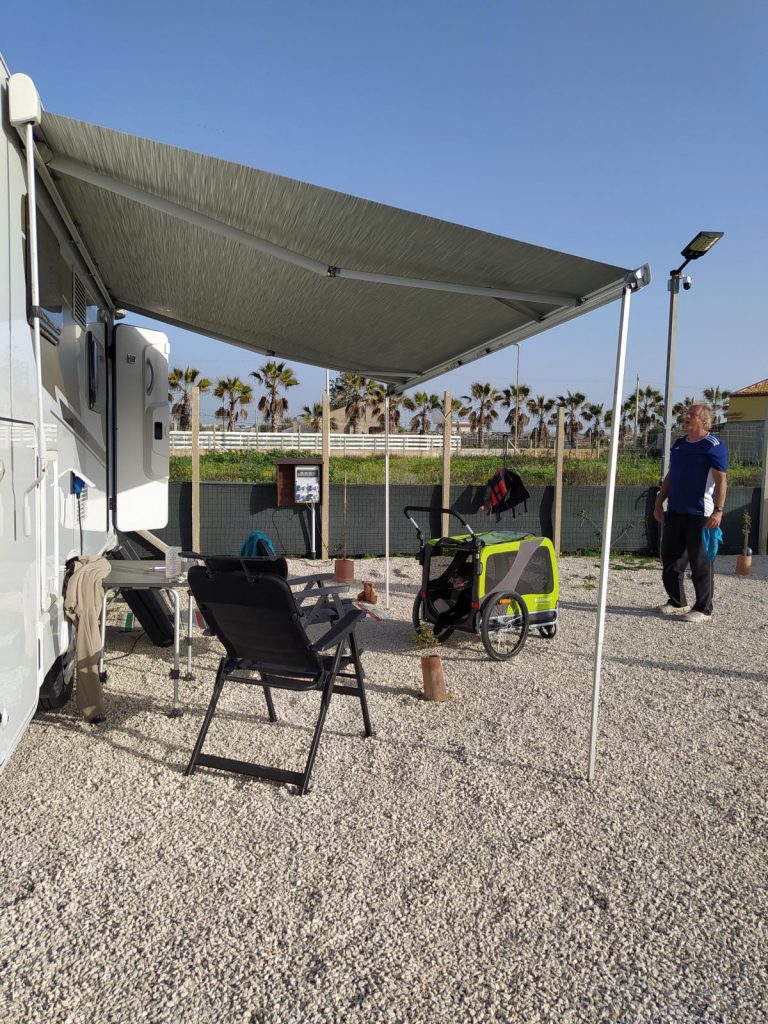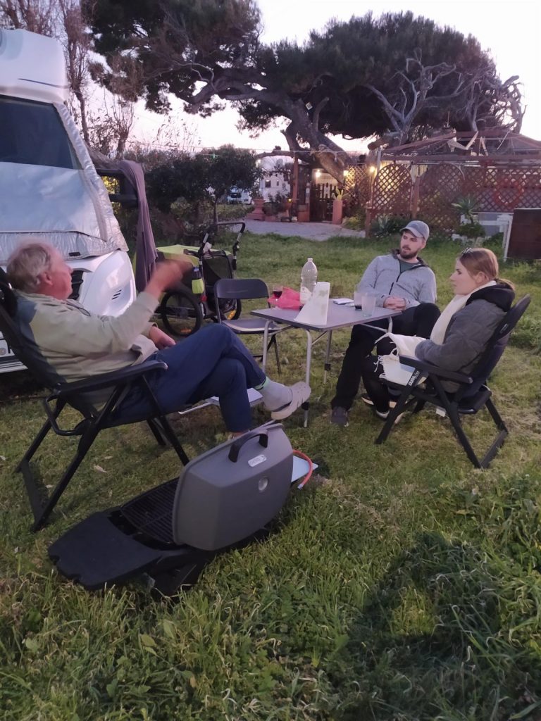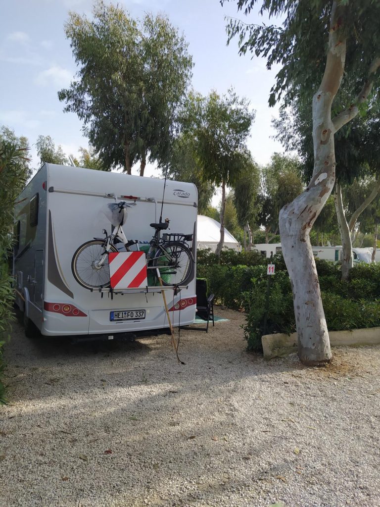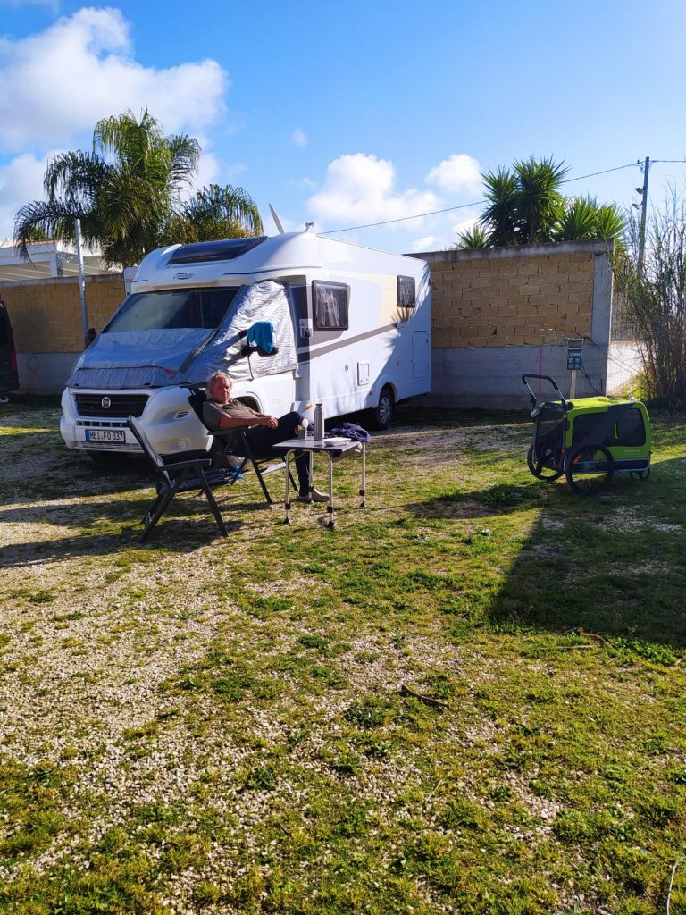 Zum Wochenende füllte es sich auf ca. 16 Parteien, da die einheimischen Sizilianer Camper mit ihren Gurkenmobilen zum Karaoke-Wochenende kommen, oft mit Kind und Kegel. Dann kann es etwas hektischer werden und kuschliger. Auf diesem Platz verteilte sich das ganz gut, und am Freitag zogen wir um auf den vorderen Platz von Salvo, den wir in den 5 Tagen dort erkundeten mit Fahrrad oder E-Roller.