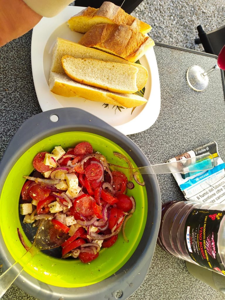 Guter Nachbar Jan aus Münster, Erzieher, der mit 48 mal raus musste und nun mit Auto und Kühlschrank seit Mai unterwegs ist. Gesamter Balkan, Griechenland, nun Italien, will noch nach Marokko. Den ersten Abend killten wir 2 Flaschen Wein, haben noch per WhatsApp Kontakt, fährt uns quasi voraus.