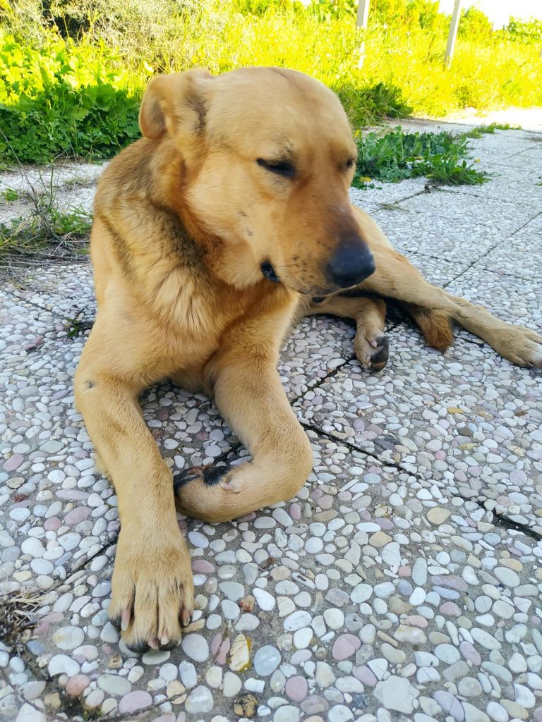 also dort wo Leute Essen wegwerfen oder die Jungs auch füttern. Also die erste Begehung war quasi ein Spießrutenlauf für Mensch und Hund. Jetzt nach ein paar Tagen haben wir die Erfahrung gemacht, „sie hauen eigtl. ab, wenn wir sie fortschicken, also der Mensch“. Bei einigen bilden sich Rudel oder Einzelhunde, die einem dann folgen bzw. uns. Da hilft eine Wasserflasche, mit der man spritzt oder man beugt sich runter auf die Straße, tut so, als ob man einen Stein werfen will, dann flitzen die meisten ab. Therapie für Fella, denn irgendwann lohnt kein Bellen mehr, völlige Reizüberflutung. Ole „guckt nicht einmal mit dem Arsch hin“. Nur einmal im Ort, Mitte des Ortes, wechselten wir die Straßenseite oder drehten ab, denn da sitzt der Rottweiler. Der alte Oberboss von allen. Das war sogar Dimi zu riskant und wir nahmen einen kleinen Umweg. Ich denke es liegt daran, daß die Griechen eher zu freundlich sind. Also eher hart nach außen gegen Tier und Umwelt, doch eigtl. füttert fast jeder die Jungs und eingeschläfert wird auch keiner, solange er nicht Ärger macht. Natürlich „Kacke weg machen“, gibt’s hier nicht. Überraschenderweise sehen die wilden Hunde hier ziemlich gut genährt aus, will nicht sagen fett, aber nahe dran. Auch nicht mit Zecken übersäht oder so.