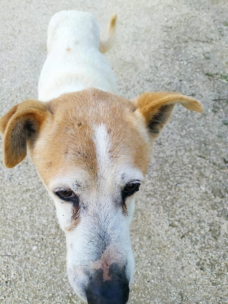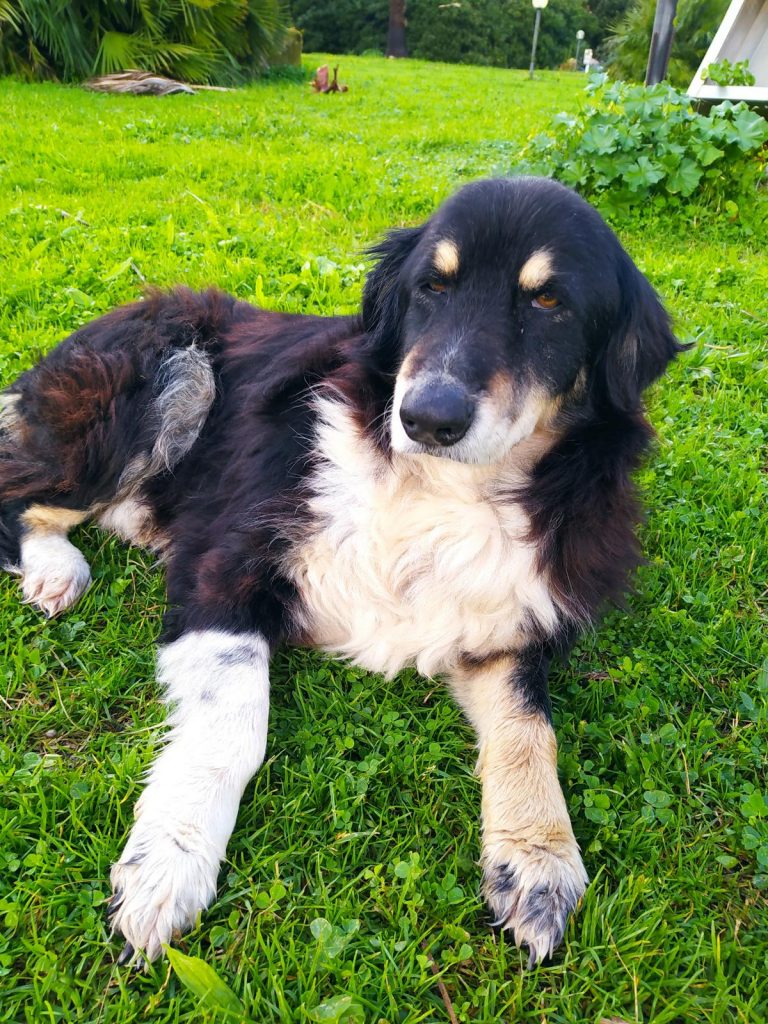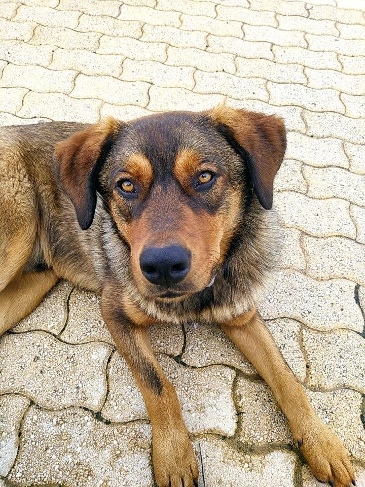Dimitra und 3 ihrer eigenen Hunde und unten Pflegehund „Bono“ – ein ganz spezieller Fall