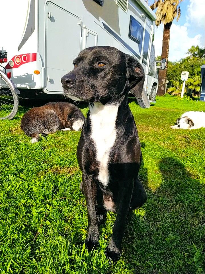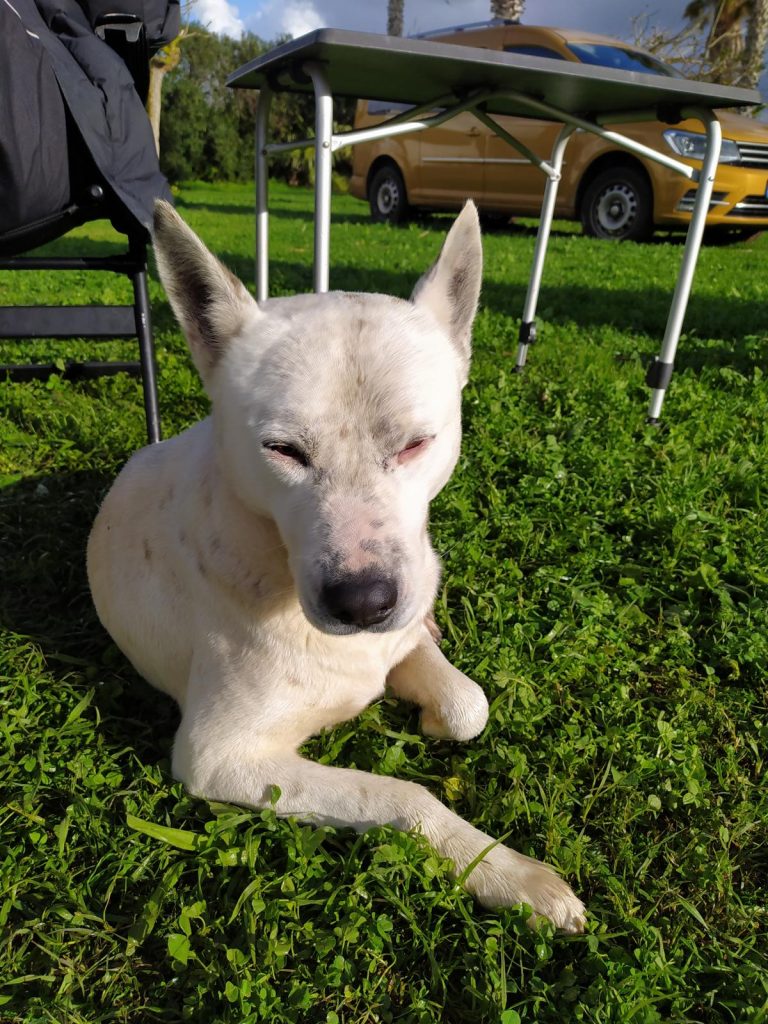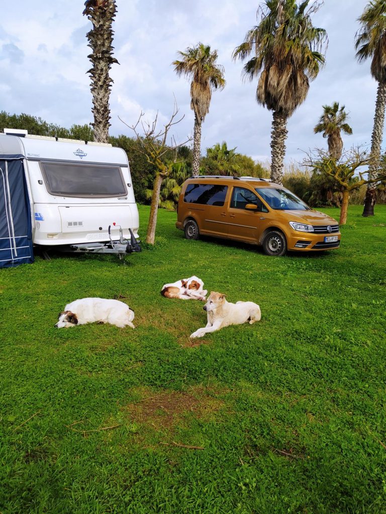 Auf der Strecke zuvor die 50km entlang der Küste war kaum Verkehr und kein Womo weit und breit zu sehen, außer bei dem Camp. Auch schon Kontakt gehabt mit ein paar Streunern, mit denen sich Sylvie gerne noch länger beschäftigt hätte um etwas Fellpflege zu betreiben. Standen aber ungünstig und so reichte es nur für ein paar Happen Trockenfutter, bisschen Wasser und Streicheleinheiten.