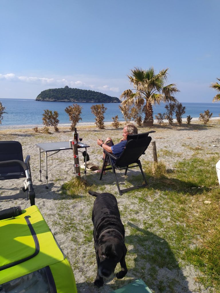 Er wird mal wieder Zeit für den nächsten Zwischenbericht. Gegen unsere ursprüngliche Planung für ein paar Tage nach Chalkidiki, drei Finger östlich von Saloniki, zu fahren, sind wir nur am Sonntag letzte Woche zu einem Tagesausflug ans Meer Richtung Katerini gefahren. Auf der Landstrasse sind es knapp 44km. Durch einige Dörfer mit holpriger Straße kamen wir nach Alyki oberhalb von Katerini an einen Sandstrand und einem Hafen für Muschelarbeitsboote und kleinem Privathafen. Dort angekommen standen ein Bimobil und 2 Vans herum. Van-Life, die neue Bewegung, daß sich junge Menschen nach dem Abi oder Studenten einen „olllen“ Transporter oder Van kaufen und aufs Notwendigste beschränkt als Womo umbauen, ist allgegenwärtig. Auch die beiden Vans waren mit ca. 5 Leutchen besetzt, keiner älter als 22 Jahre und natürlich Deutsche. Später tauchte noch ein Dritter auf, ein Holländer-Päärchen. Man steht einfach am Strand unweit von den Hafenanlagen, wo sich 100 griechische Angler aufhielten.
