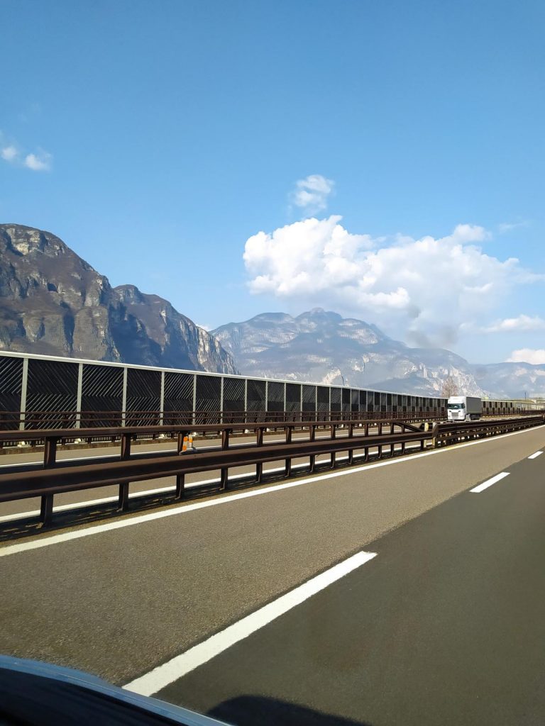 Jedenfalls ging die Schranke auf. Und nun sollte man wissen, wohin man möchte, denn die unmittelbare Ausfahrt teilt sind in 4 Abfahrten, und man hat nur einen kurzen Moment zu entscheiden. Und Italiener fahren schmerzfrei. Alles gut, richtig getroffen. Dann ging es 30 km Landstraße zu dem ausgewählten Stellplatz, 10€ alles incl. Dort angekommen, „Schild geschlossen – Kommune“ mit Kette verschlossen. 2 Womos (Italiener) standen einfach auf dem Parkplatz für PKWs davor. Aber nee, zum Anfang so einen Spot, nee beim besten Willen nicht. Trotz ermüdender Fahrt Weiter! So kamen wir zu dem oben genannten See, zwar kein Strom, aber Entsorgung, Müll und Wasser. Alles gratis. 20m entfernt kleiner Laden mit tollen Brotsorten zum Abendbrot und Frühstück und eine Trentino Flasche (es ist dort nämlich das gleichnamige Weingebiet) gab es auch. Und Spot am See ist OK. Und kein Wasser mehr am kommenden Morgen an der Scheibe, also auch kein Lüfter mehr nötig. Wir sind im Süden.
