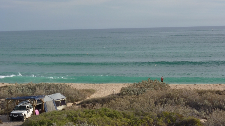 Am Abfahrtstag hatten wir Eis morgens auf dem Tisch, und die Batterie sagte, „zu kalt, keinen Bock“. Dank unseres Jumpstarters aber kein Problem, an die Batterie ran und schon lief der Wagen wieder. Hier auf dem Campground hat der Chef ein Batterieladegerät organisiert und die Batterie hängt seit gestern am Netz und Frischwasser. Die läuft dann wieder wie ne Eins. Und der Jumper ist ja auch wieder voll bis zum Anschlag. Schon ein irres Teil, alles in Einem, Kompressor, Starterbatterie und Lampe und 12 Volt Ladestation für Handy und Batterien. Müssen wir aber leider auch verkaufen, viel zu schwer. Hier bleiben wir sicher bis Montag, dann wird sich heute zeigen, ob wir evtl. noch bis zum Semifinal verlängern oder wieder auf bushtour die beach entlang südwärts Richtung Perth gehen. Endlich mal wieder angeln, denn in Ellendale Pool war keine Zeit. So etwas gibts bei uns auch. Und abends zu kalt, also geniesst die Sommertage zuhause, denn bald ist es auch schon wieder um dann. Dann, wenn wir zurückkommen, und das ist nicht mehr so weit weg, zeitlich jedenfalls.