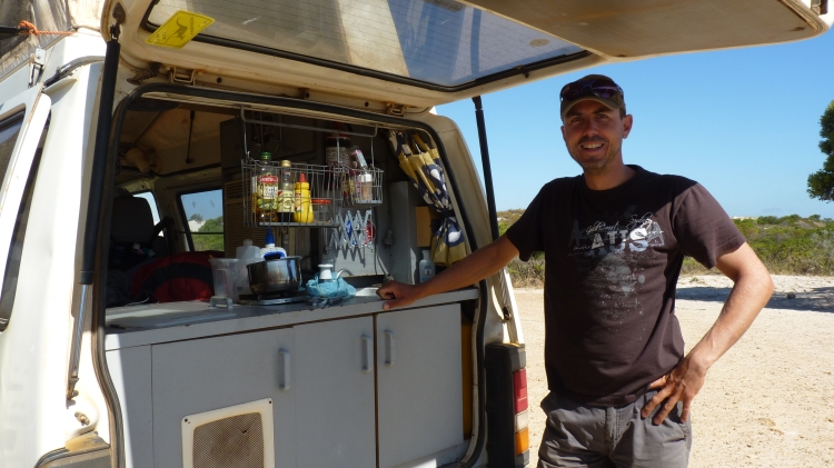 wir sind heile rausgekommen. Druck runter auf 17psi und dann tankte sich der Pajero quasi mühelos durch den Sand mit Hänger im Schlepptau. Außer, daß die beiden anderen Schweißpunkte des Gasflaschenhalters gebrochen sind (also nicht der bereits neu geschweißte), sich die hintere Klappe öffnete und nur von den Gummis der Abdeckplane gehalten wurde, so daß wir die Dettol-Sprühflasche und etliche Heringe verloren, waren keine sonderlichen Verluste außer ein paar Nerven zu beklagen. Heringe und Flasche mittlerweile in Bunbury nachgekauft. Beides braucht man unbedingt, das eine, um sich die Moskitos und Fliegen vom Hals zu halten, die anderen, um das Zelt windfest zu befestigen. Als Bonus gönnten wir uns eine große Portion Riesen-Prawns für Kilo 10$. So gab es lecker Essen mt frischem Brot, Champignon-Köpfen und Prawns in der Pfanne in Garlicsoße und angeschwitzten Zwiebeln.